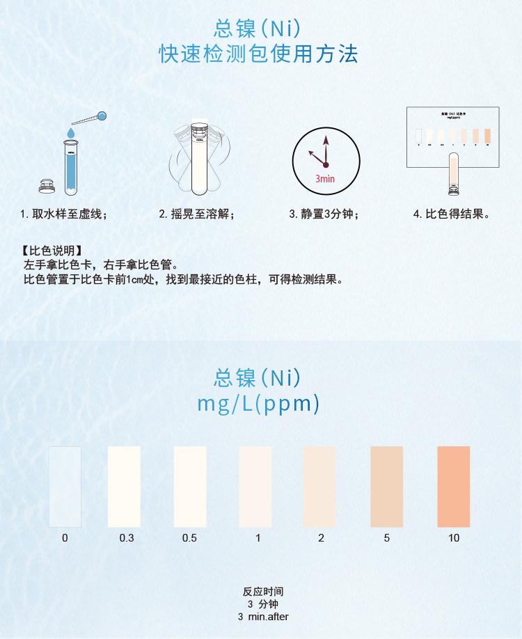 2.本產(chǎn)品檢測水中鎳離子(Ni2+)含量在0-5mg/L(ppm)范圍內(nèi),濃度過高會產(chǎn)生紅色沉淀而影響比色,若要檢測5mg/L以上濃度水樣,請預(yù)先稀釋水樣后再進行測定,具體操作見稀釋說明書。